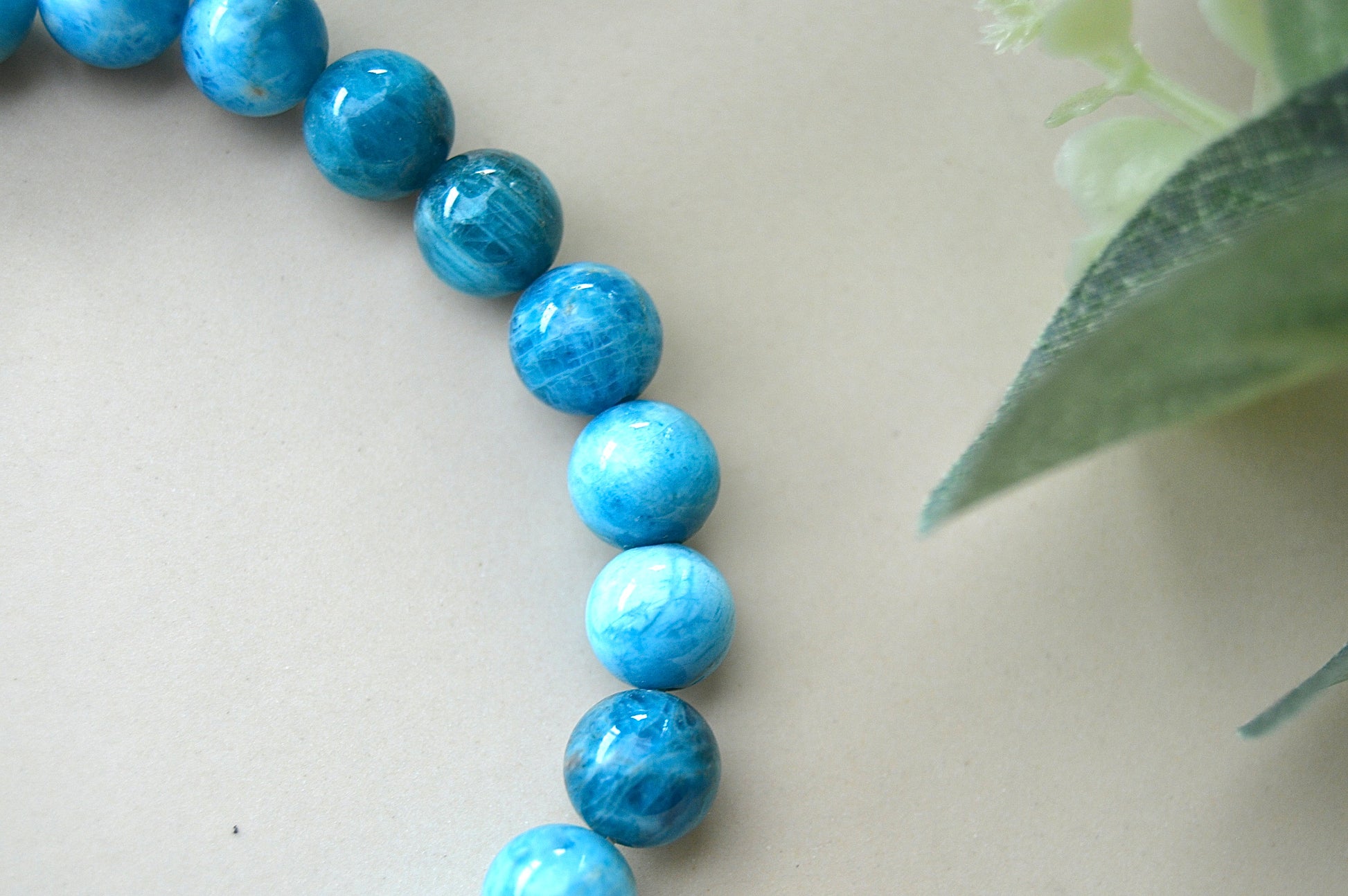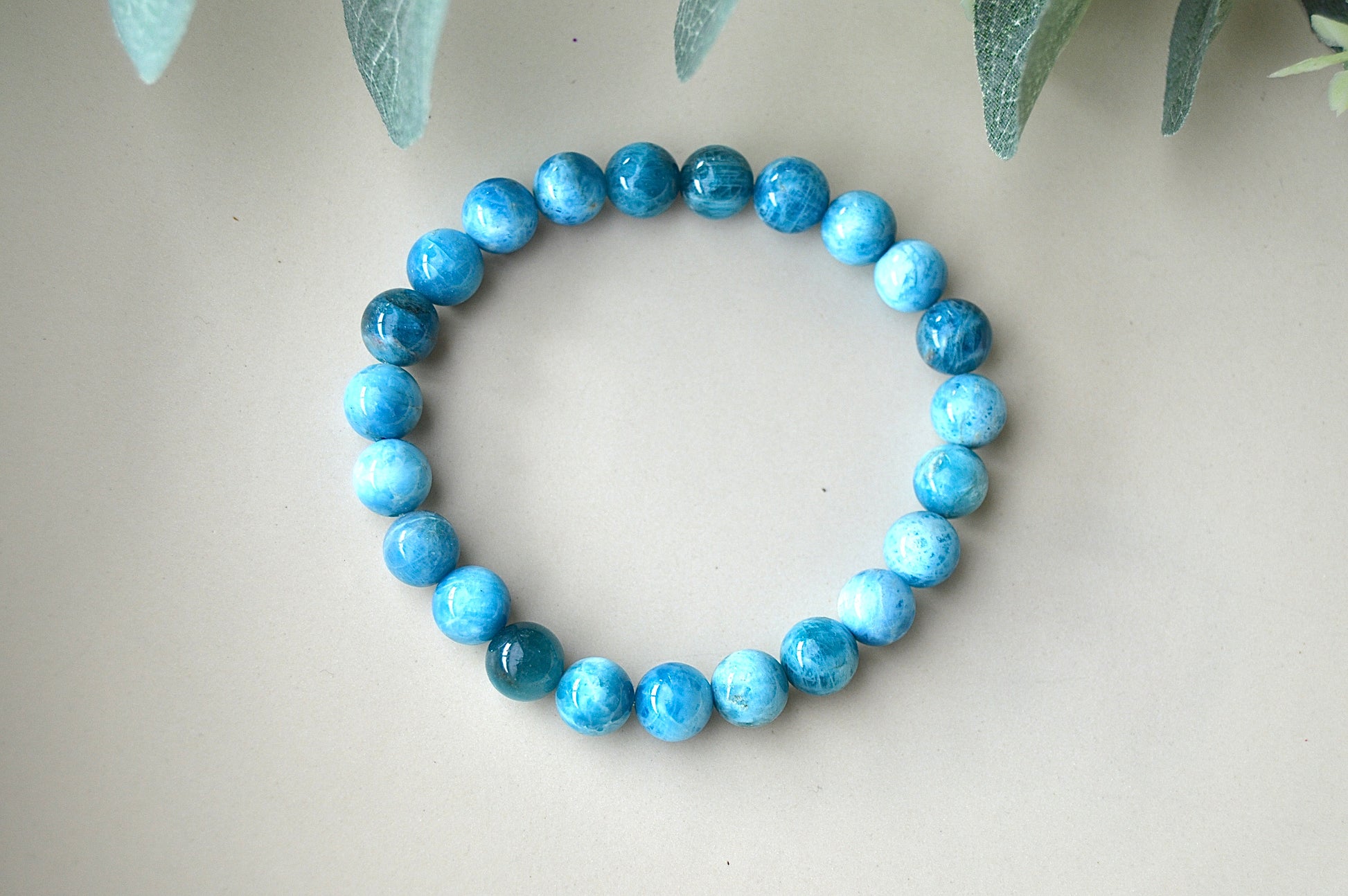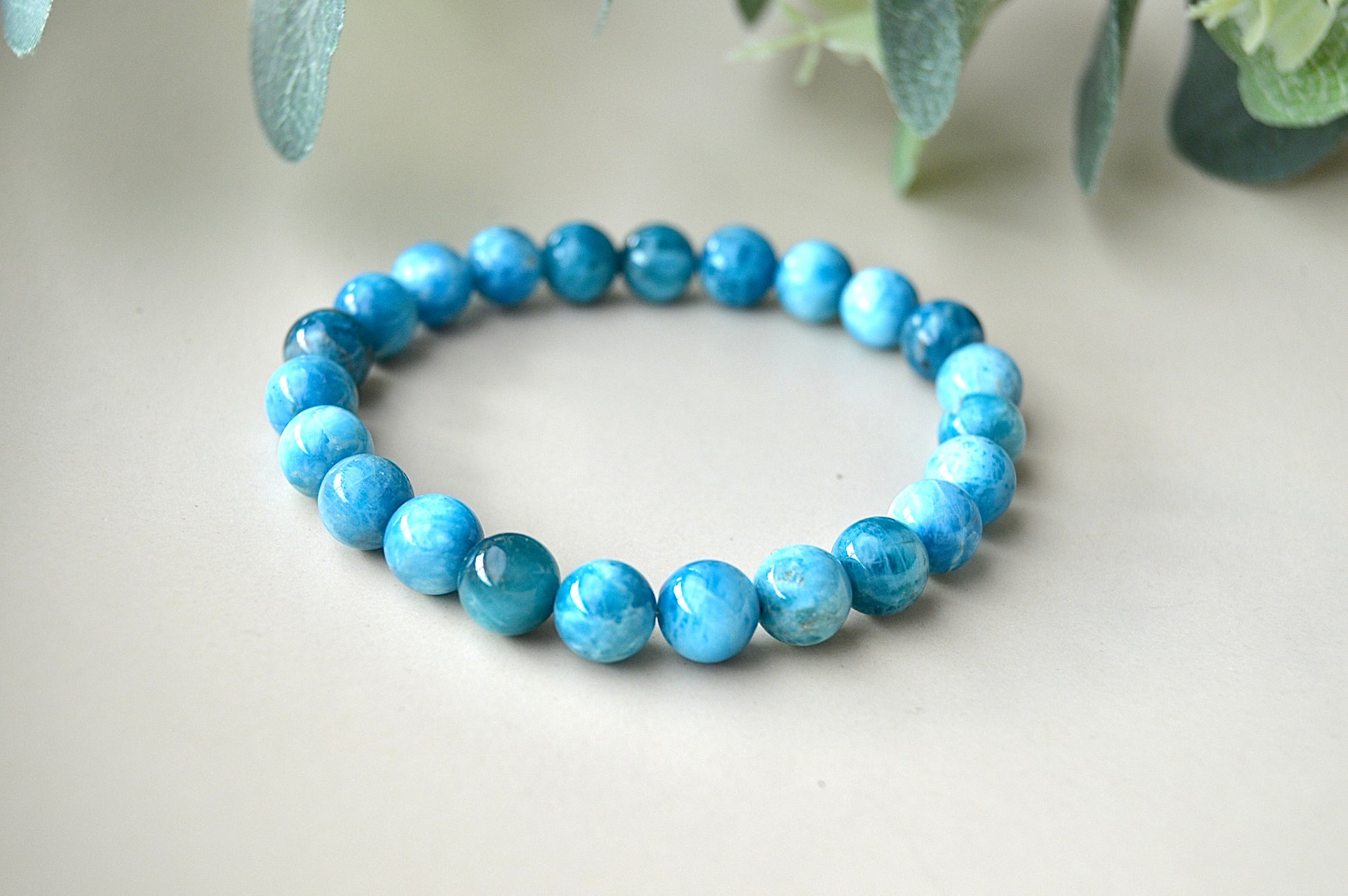 Et vakkert armbånd laget av ekte apatittperler med en størrelse på ca. 8 mm. Armbåndet har elastisk tråd som gir en komfortabel passform til håndledd på ca. 18–20 cm.