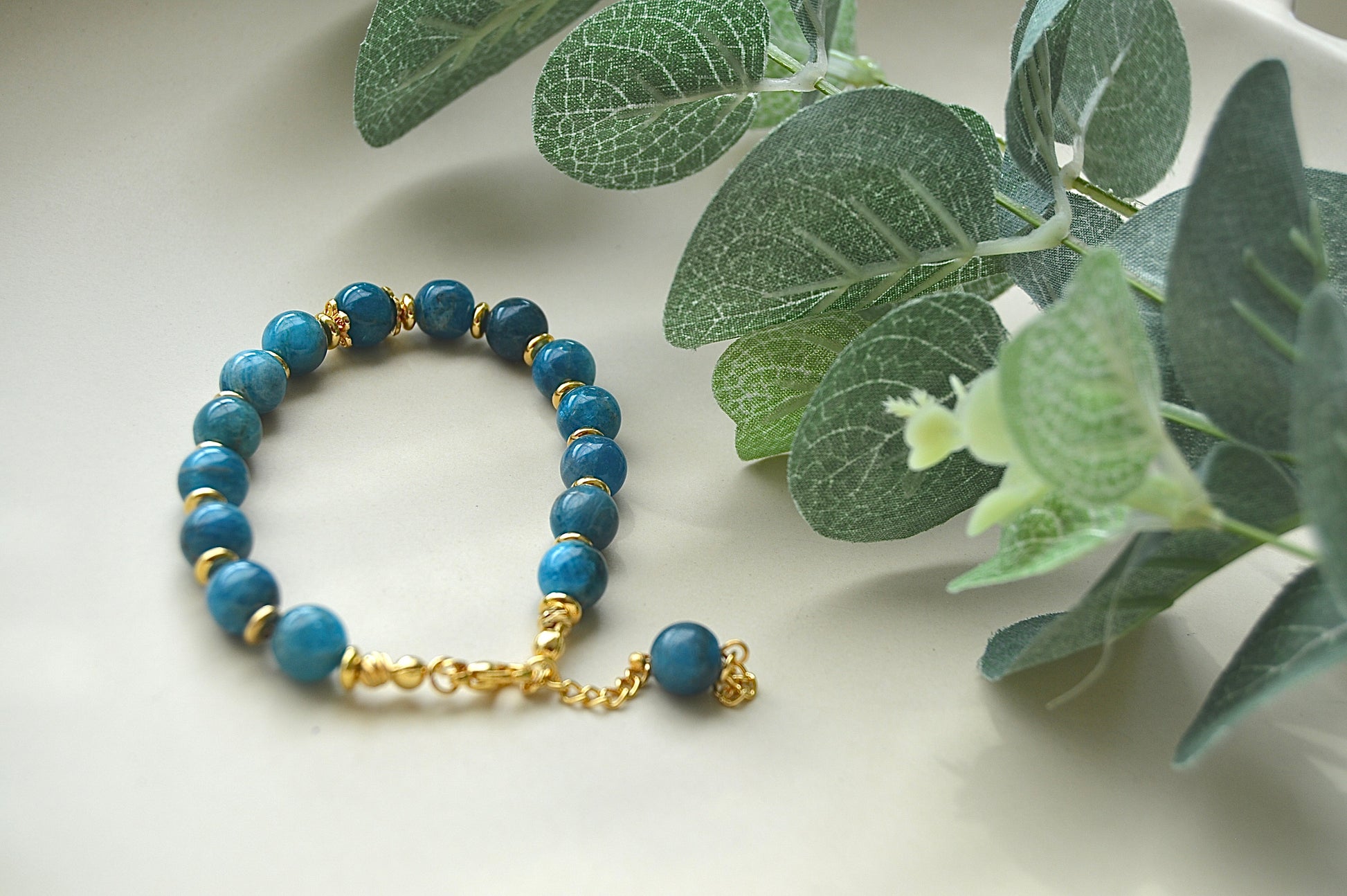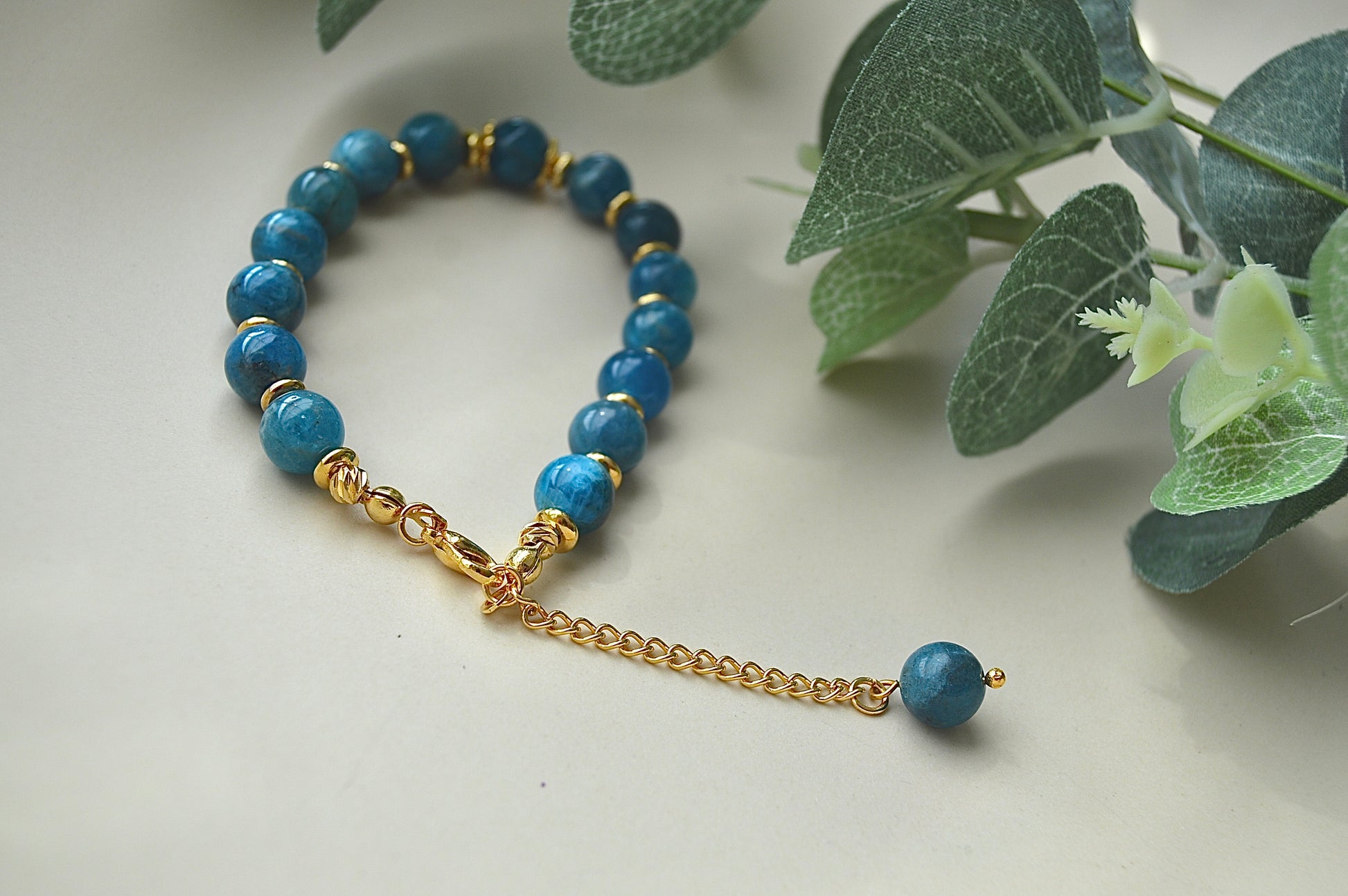 Et elegant armbånd laget av naturlige apatittsteiner, kjent for sin klare blågrønne farge og kraftfulle egenskaper som fremmer motivasjon og kreativitet. Armbåndet har en justerbar lengde på ca. 18 cm med en forlengelse på 4 cm.
