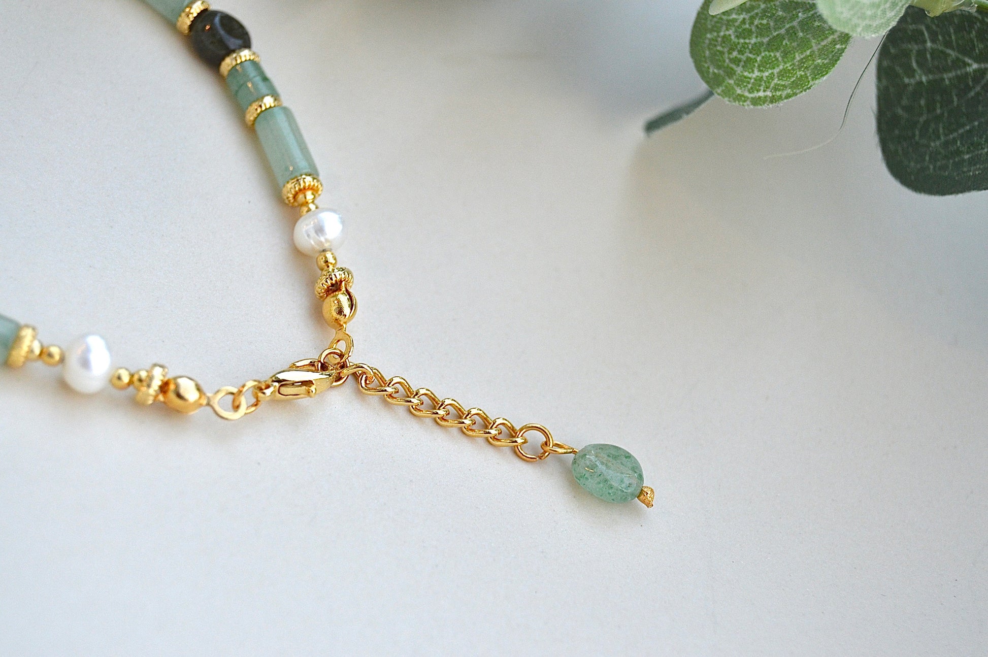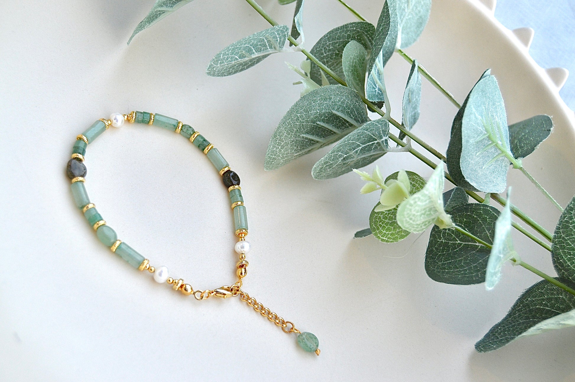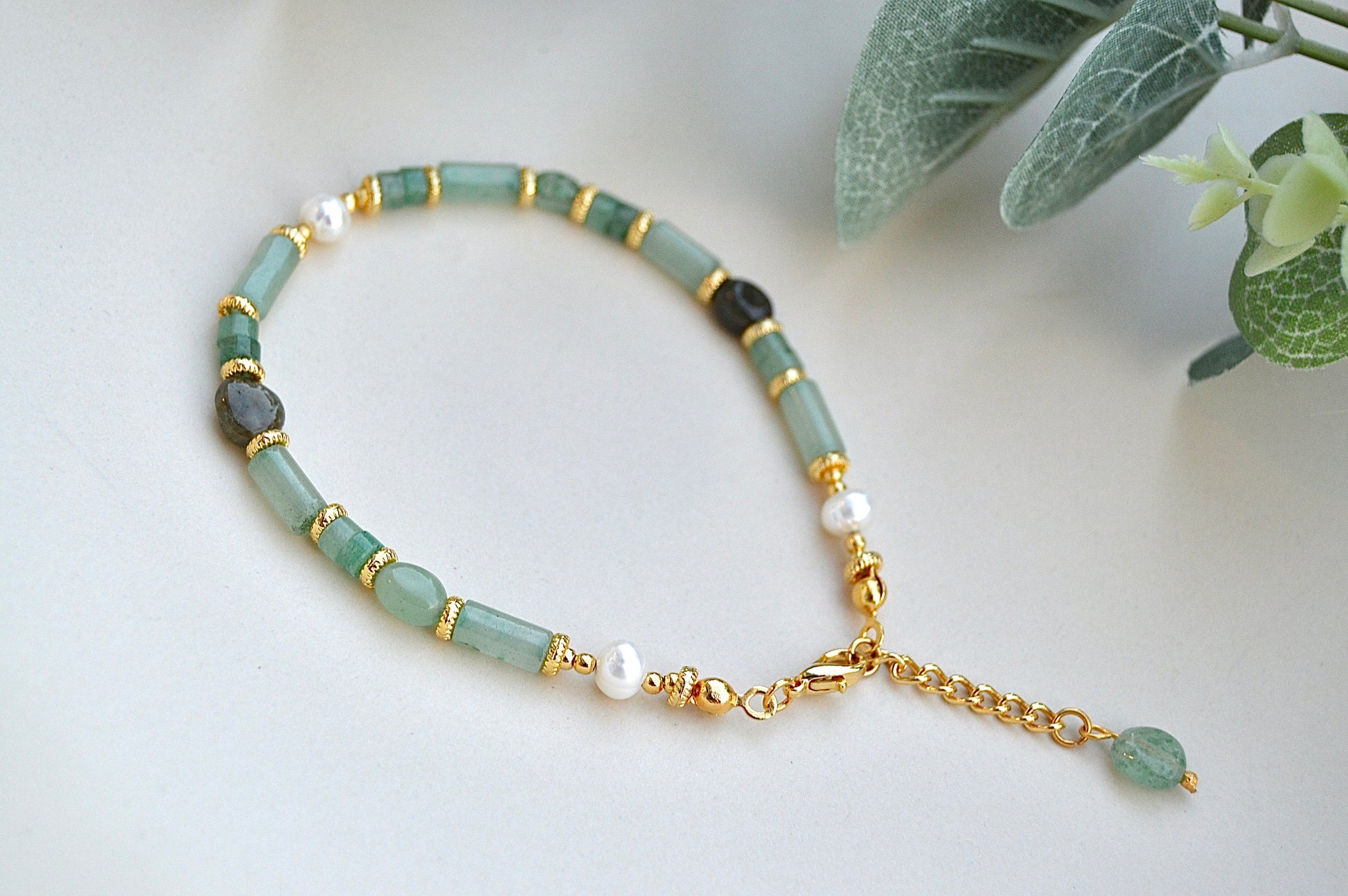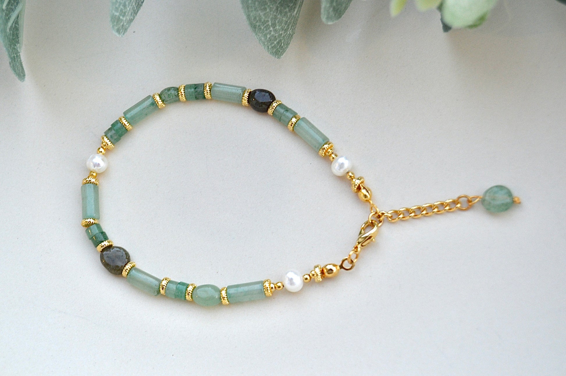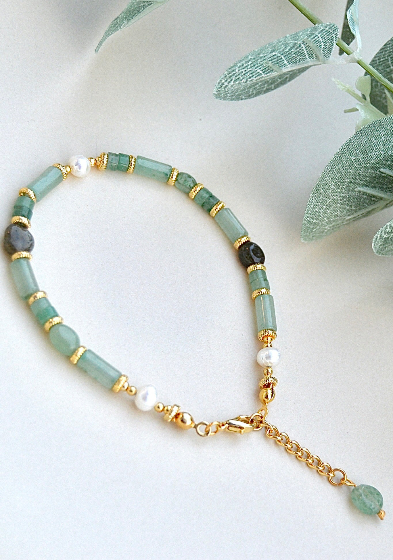 Aventurin, grønn rutilkvarts og perle armbånd – mot, klarhet og feminin ro