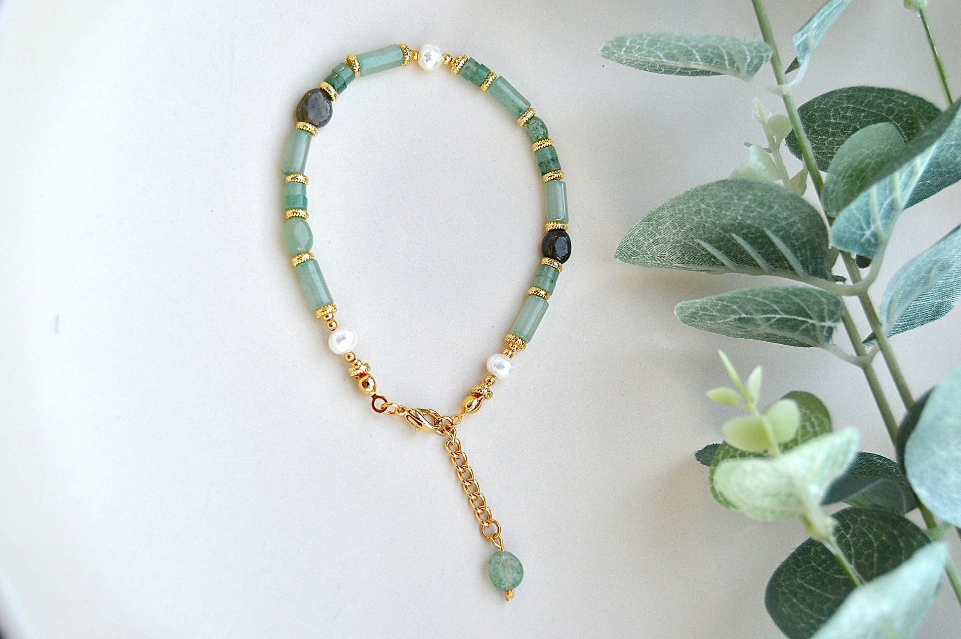 Et unikt og balansert armbånd designet med tre kraftfulle, naturlige elementer: aventurin for mot og selvtillit, grønn rutilkvarts for klarhet og healing, og ferskvannsperle for ro og feminin energi.