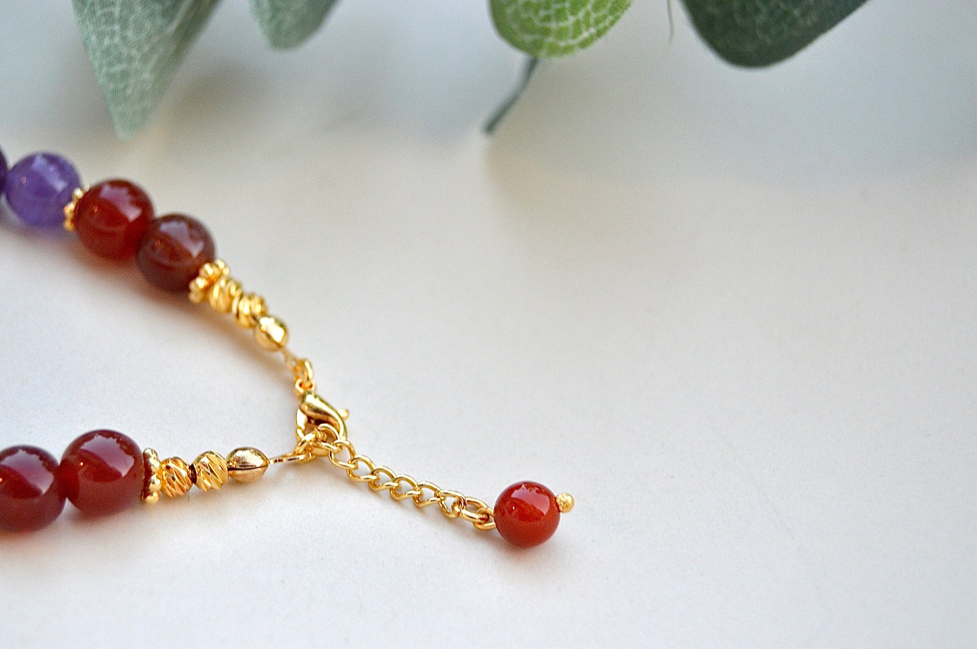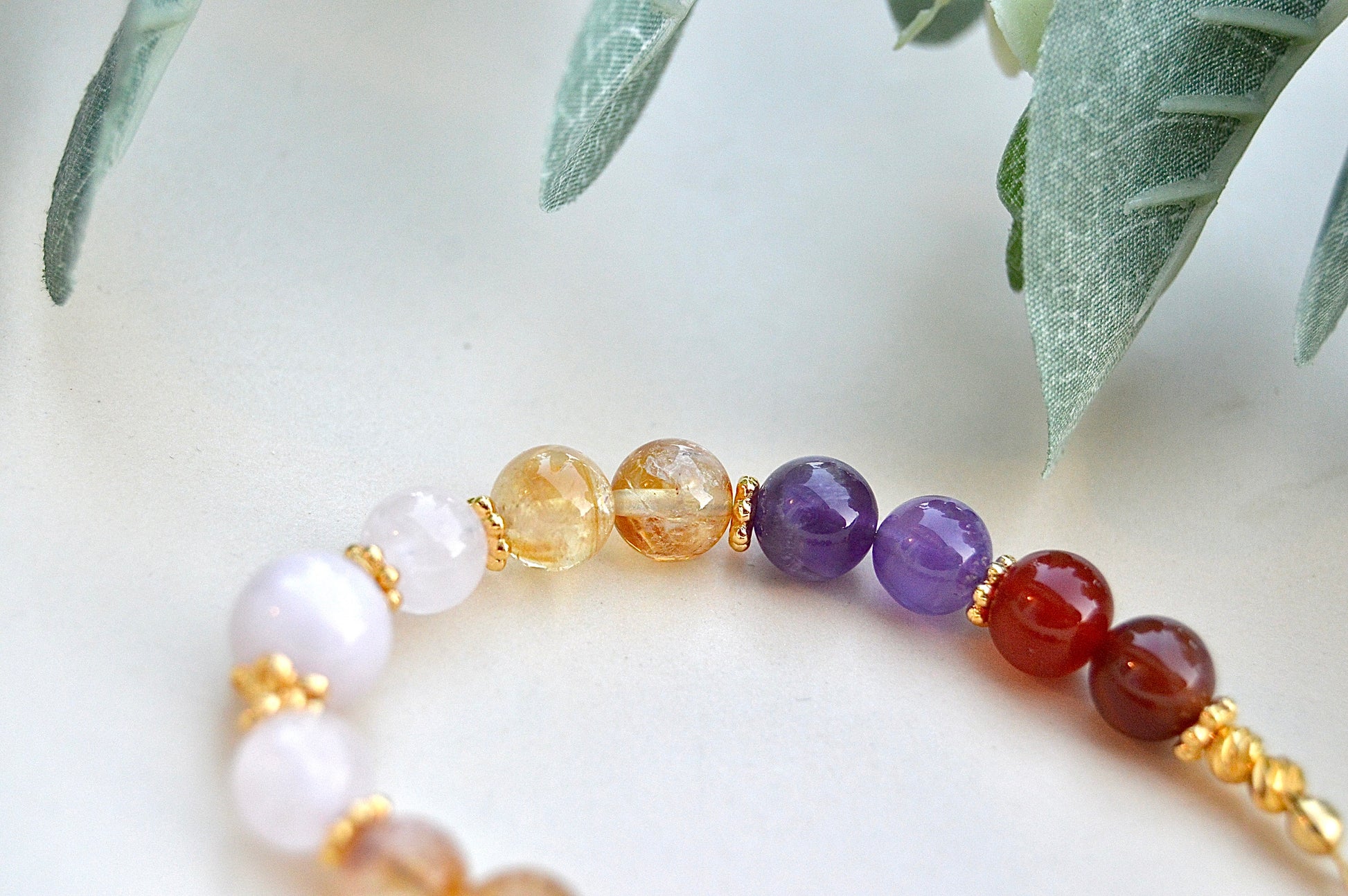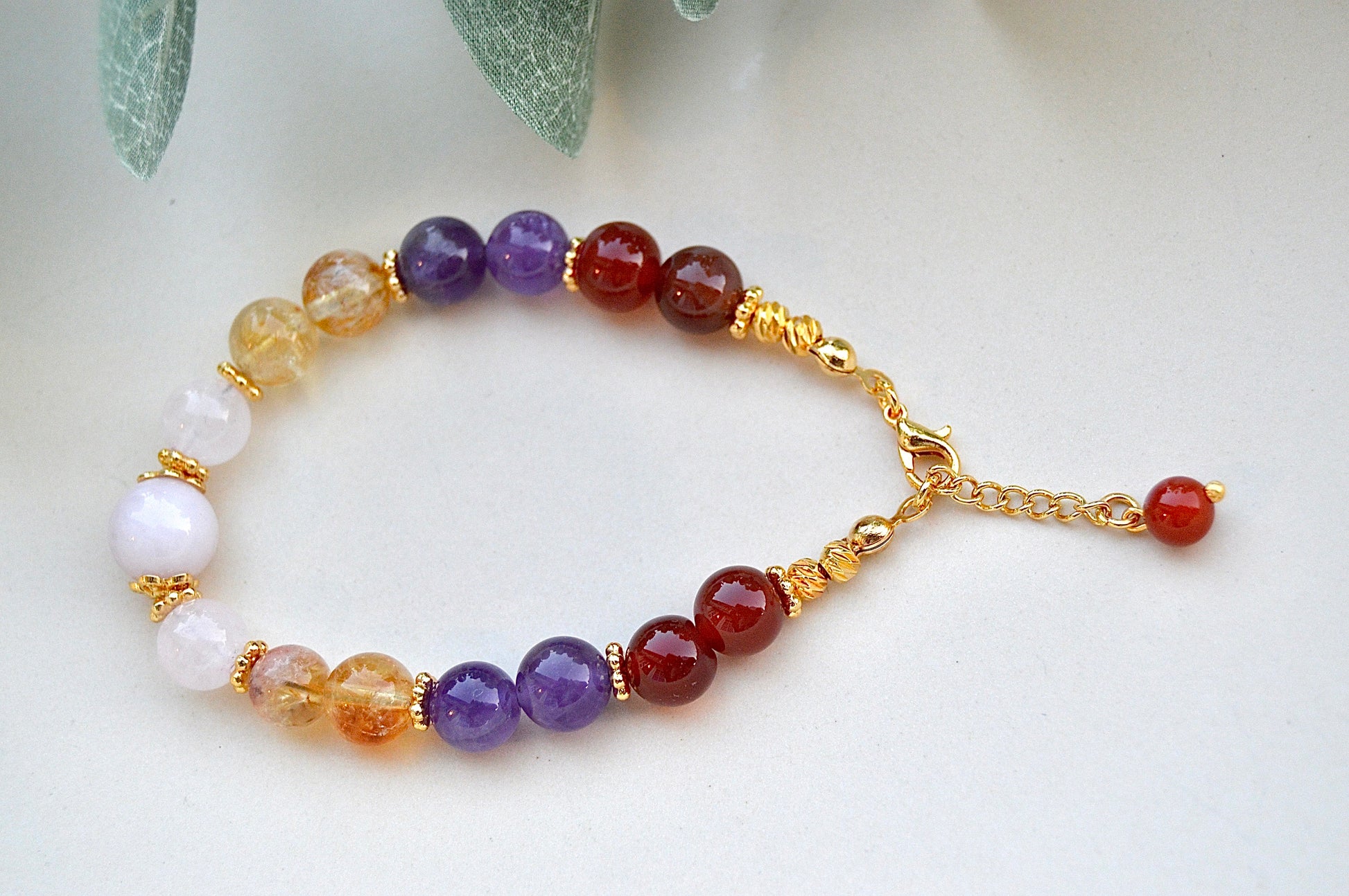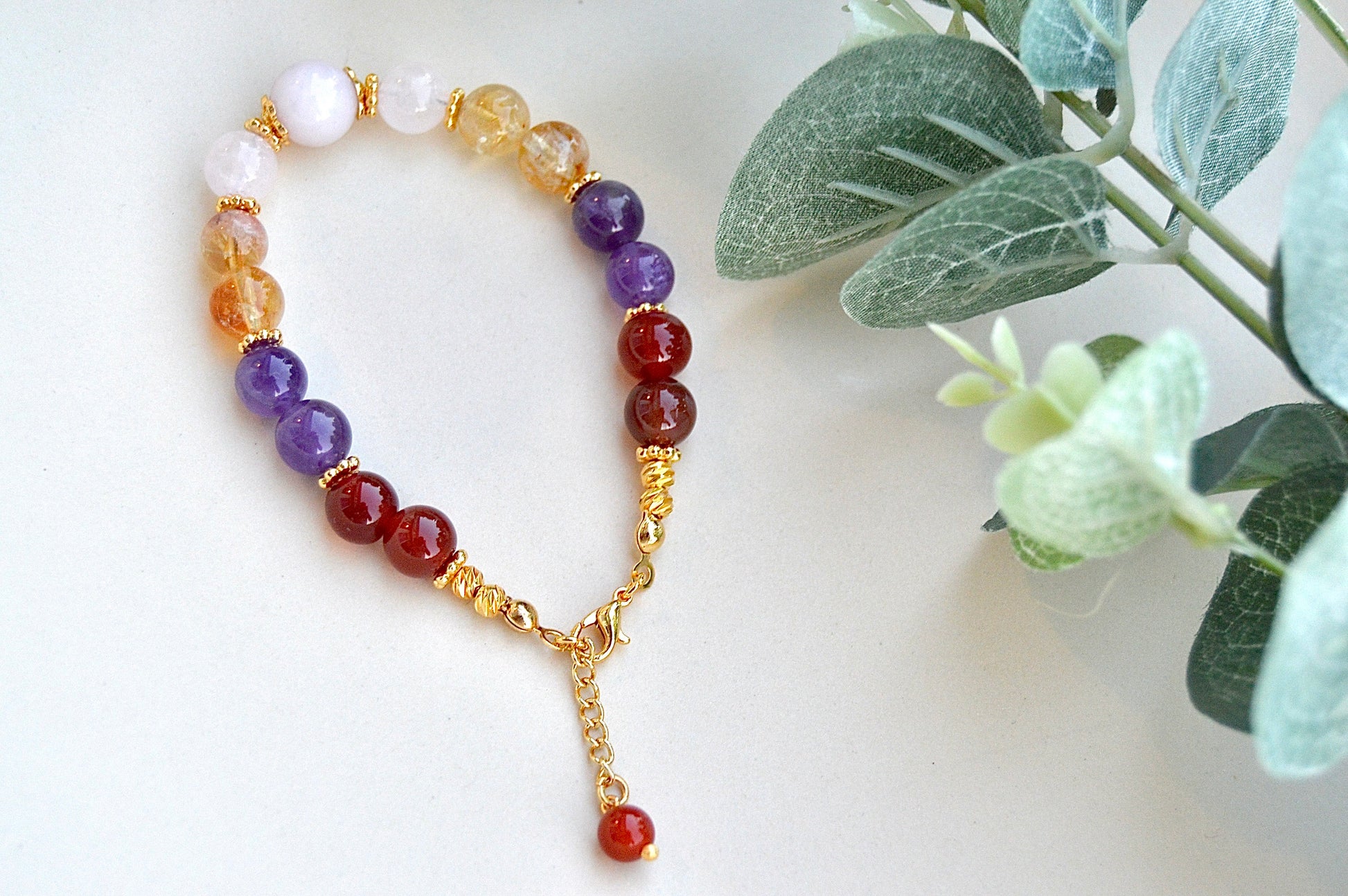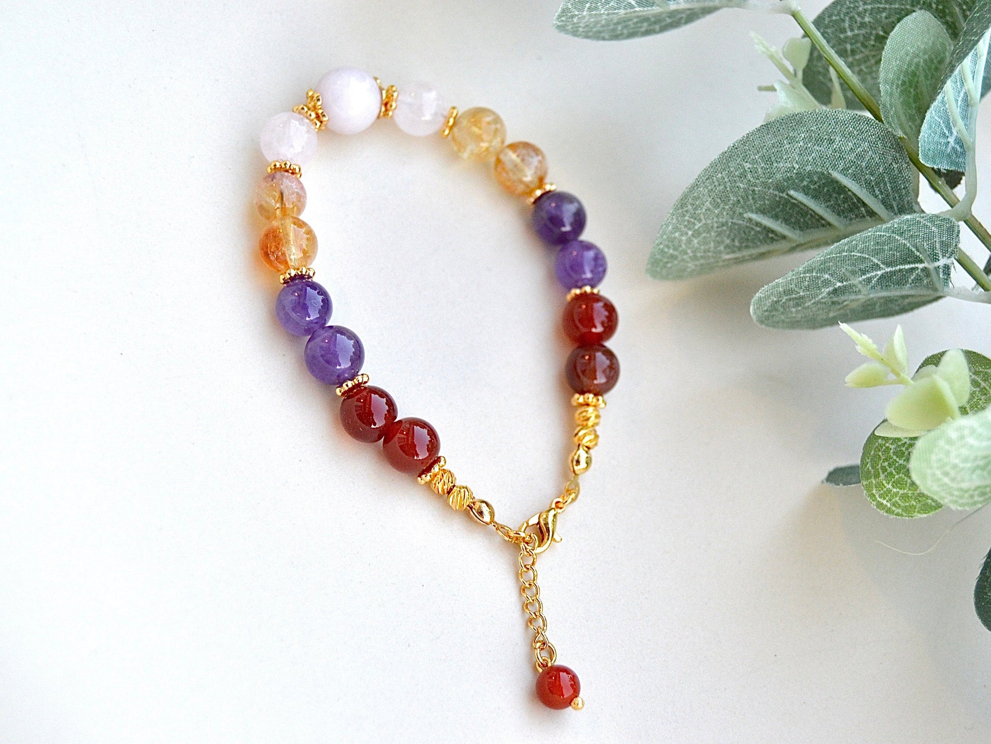 Karneol, ametyst, sitrin og rosenkvarts armbånd med gullbelagte detaljer – indre ro, glede og kjærlighet