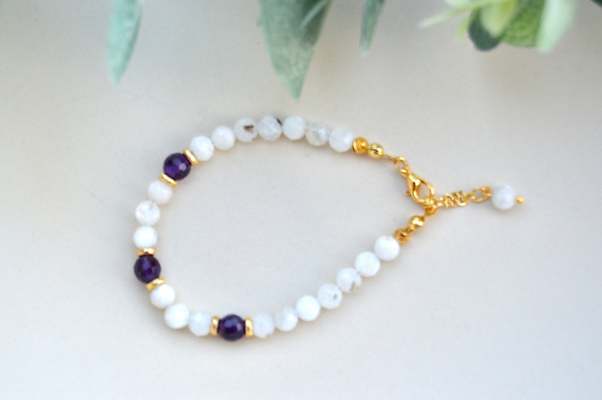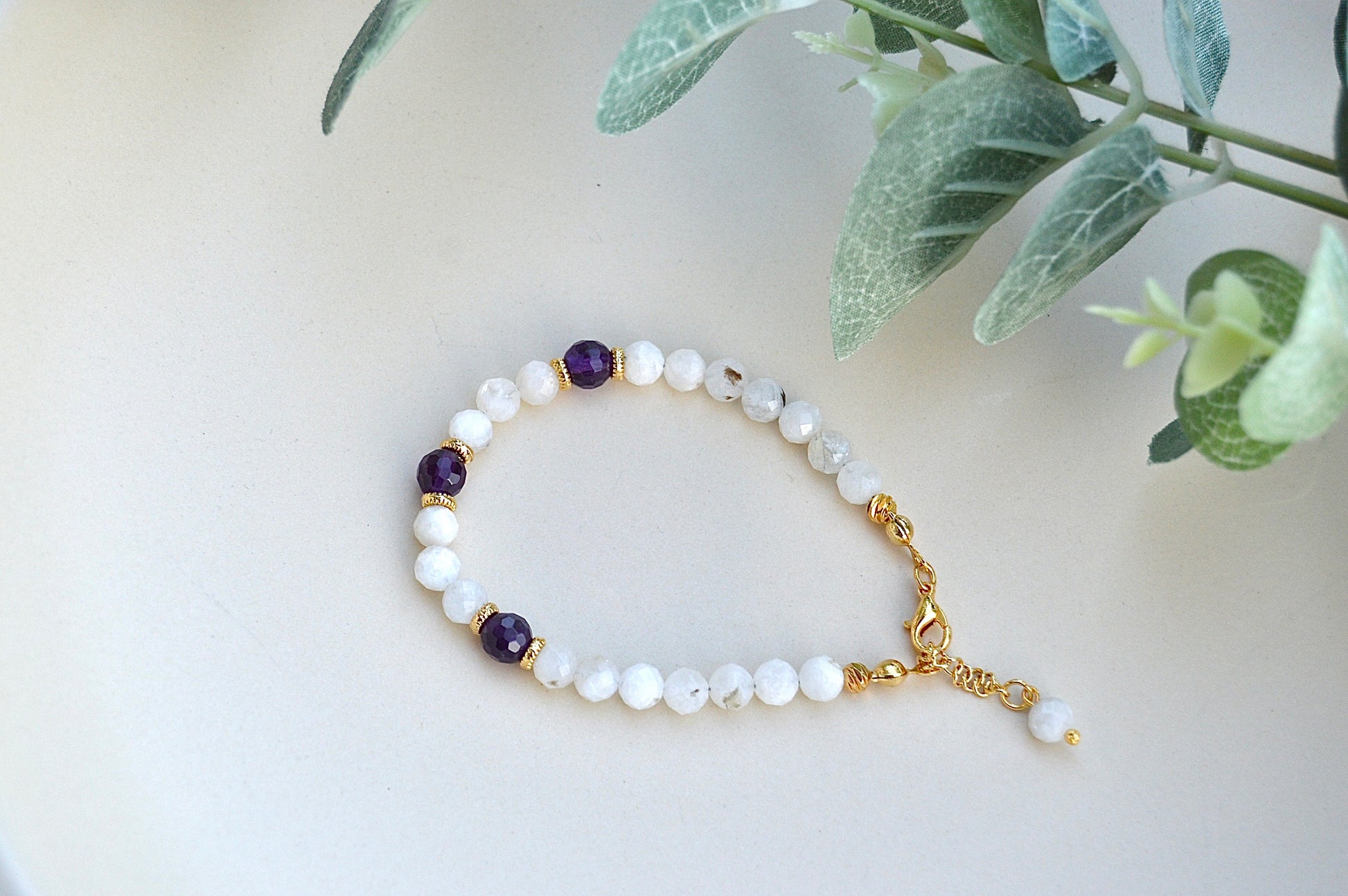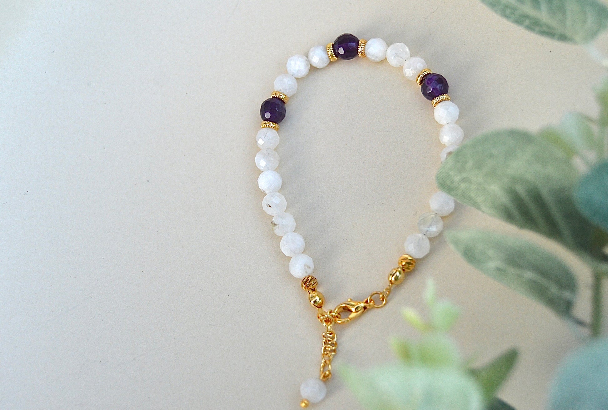 Månestein og ametyst armbånd med gullbelagte detaljer – beroligende, balanserende og elegant