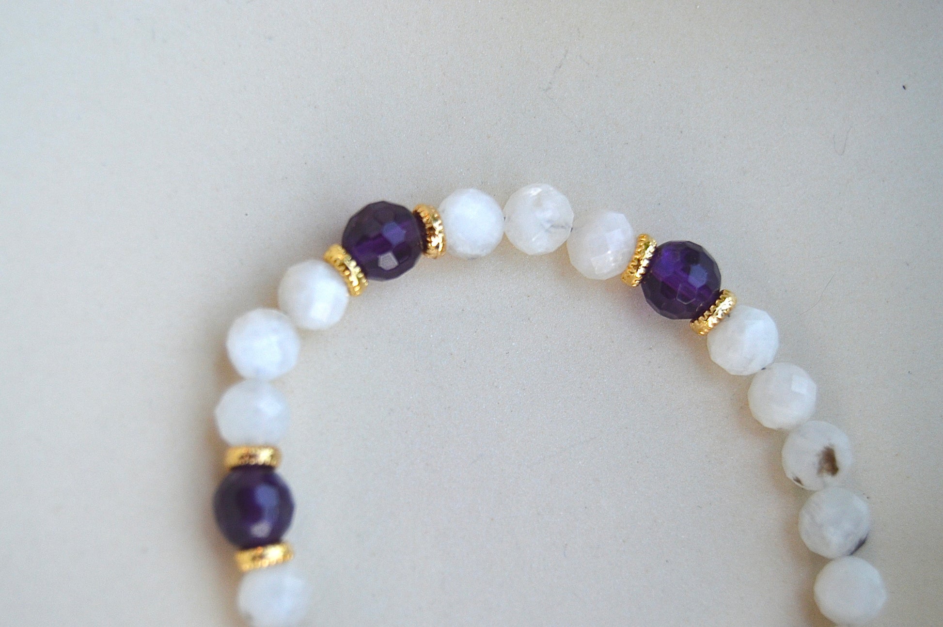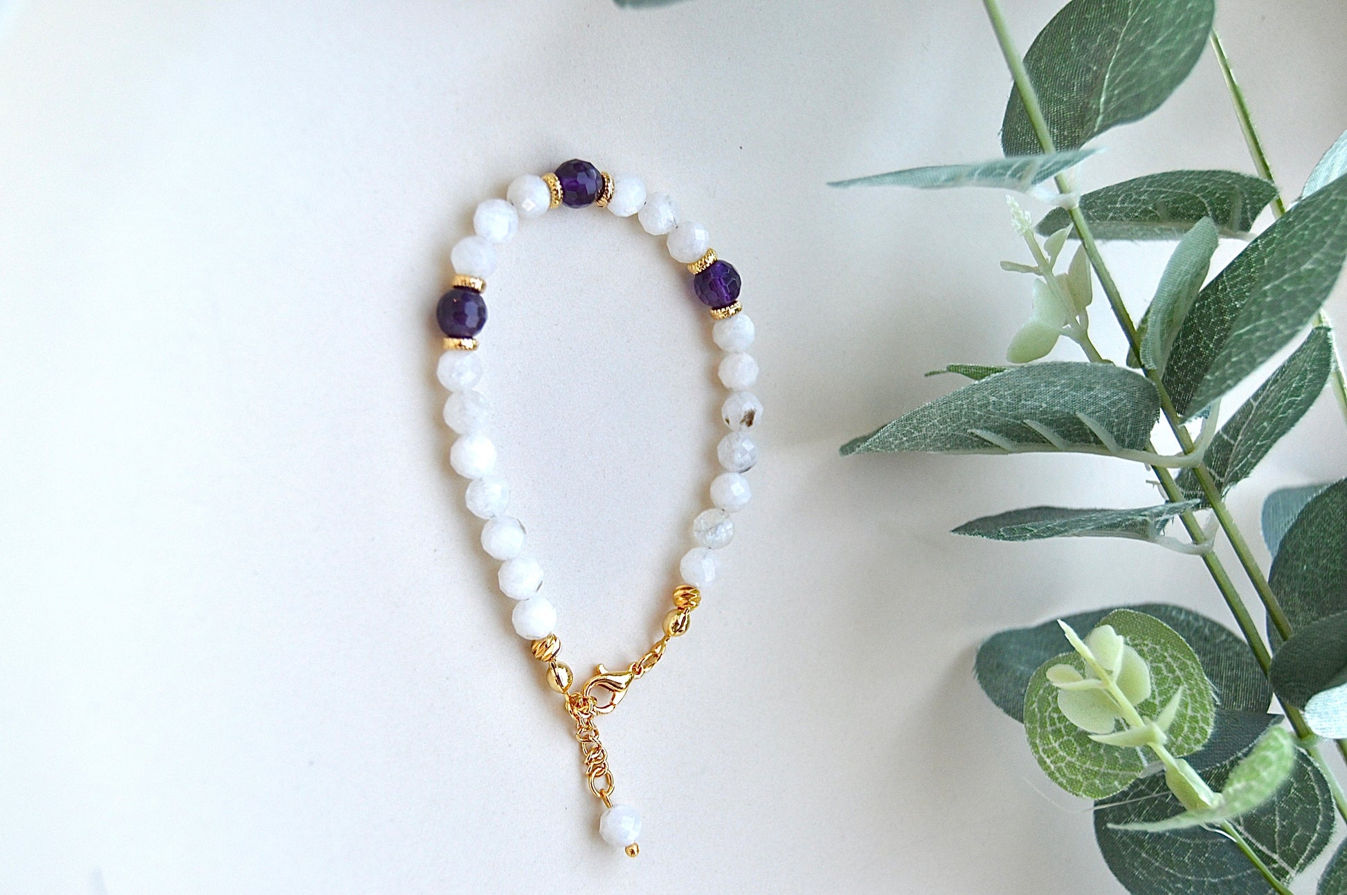 Et stilfullt og energifylt armbånd laget av ekte månestein og ametyst – to kraftfulle steiner kjent for sin beroligende og balanserende energi.