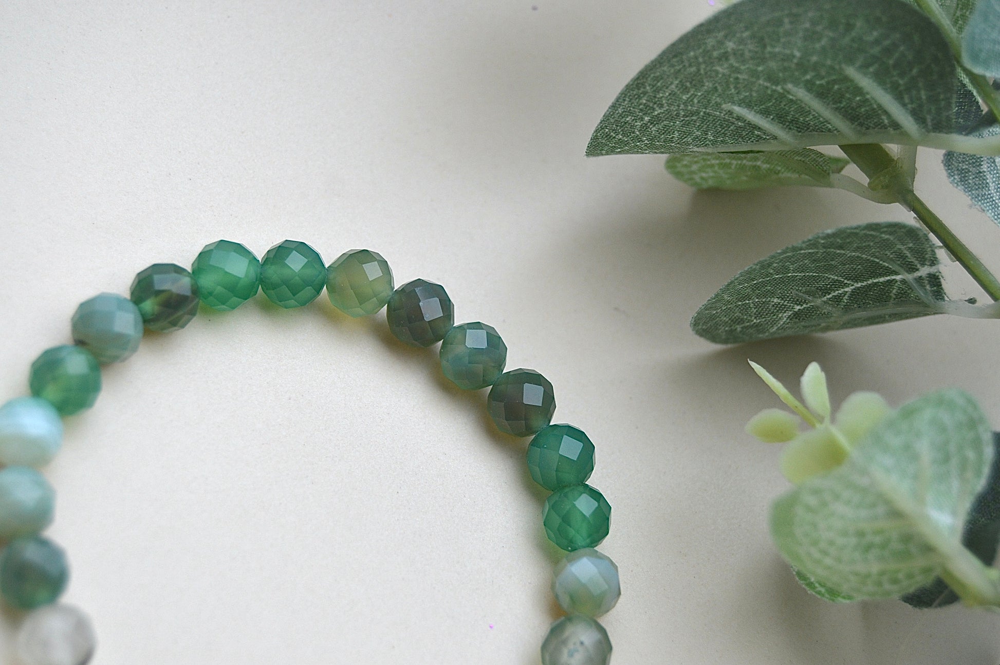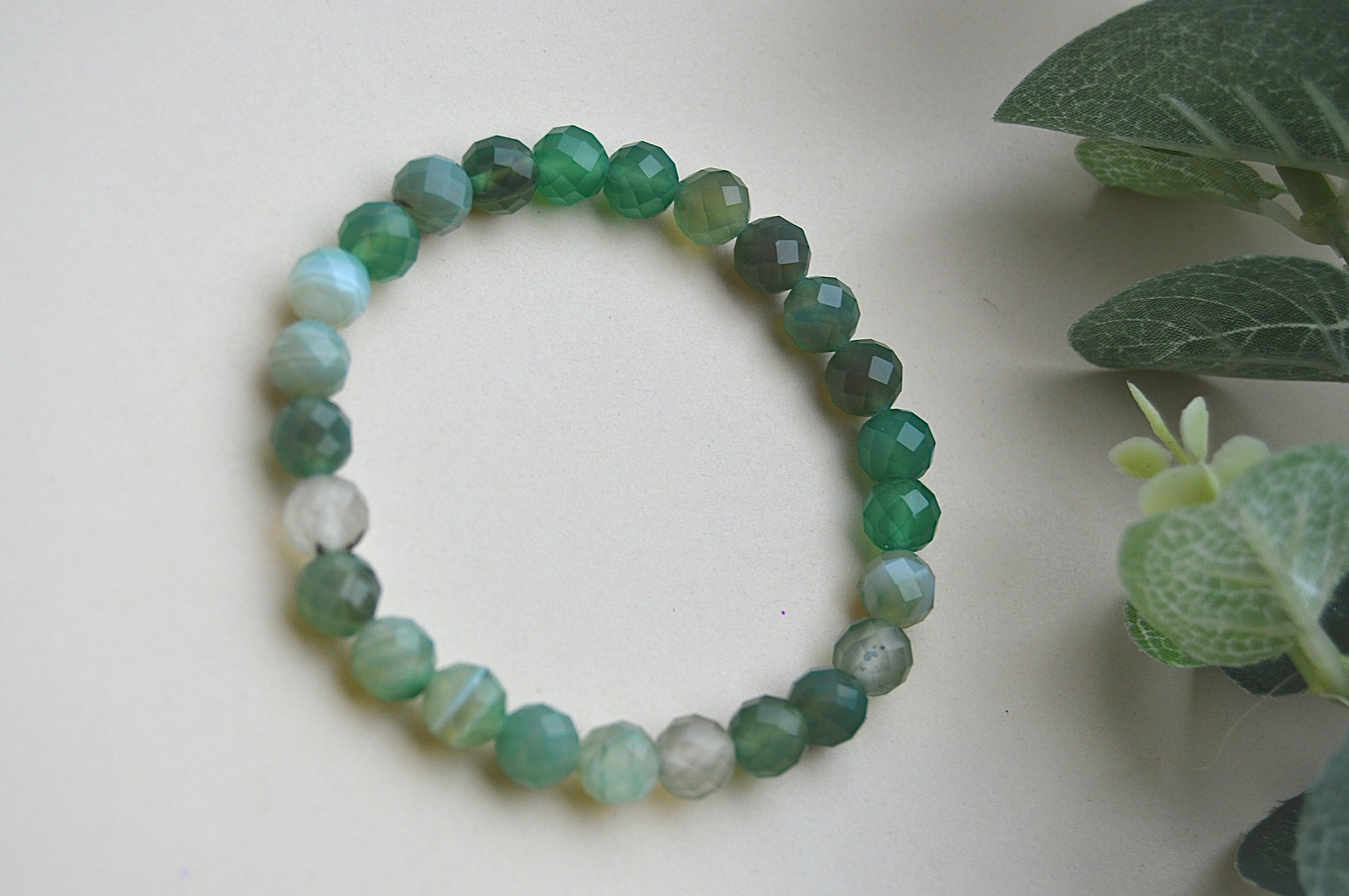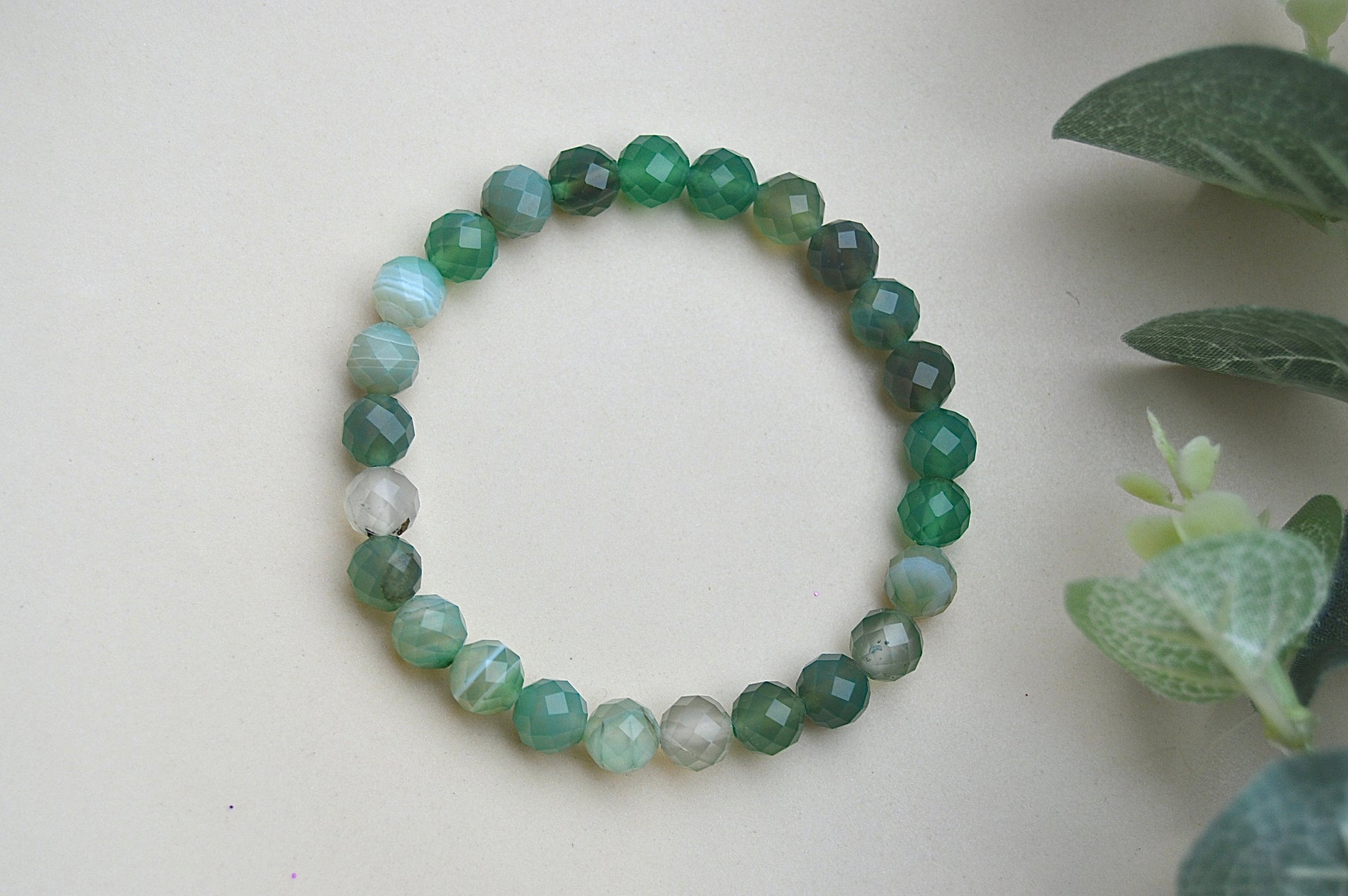 Et vakkert og håndlaget armbånd laget av naturlig fasettslipte grønne agatsteiner. Den klare glansen i de små 6 mm perlene gir armbåndet et elegant uttrykk – samtidig som det bærer med seg den jordnære og balanserende energien grønn agat er kjent for.