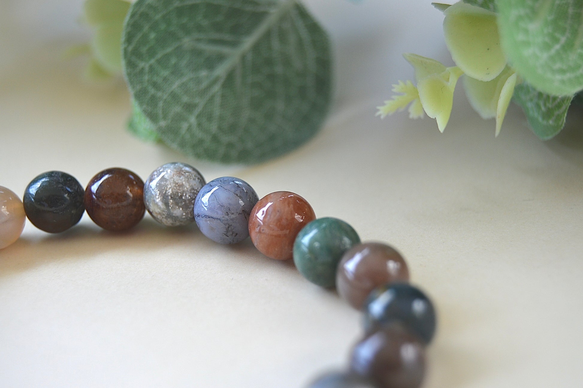 Et vakkert armbånd laget av naturlig indisk agat, kjent for sine jordnære nyanser og beroligende energi. Steinene har en størrelse på ca. 8 mm, og armbåndet har elastisk strikk som passer håndledd mellom ca. 18–20 cm.