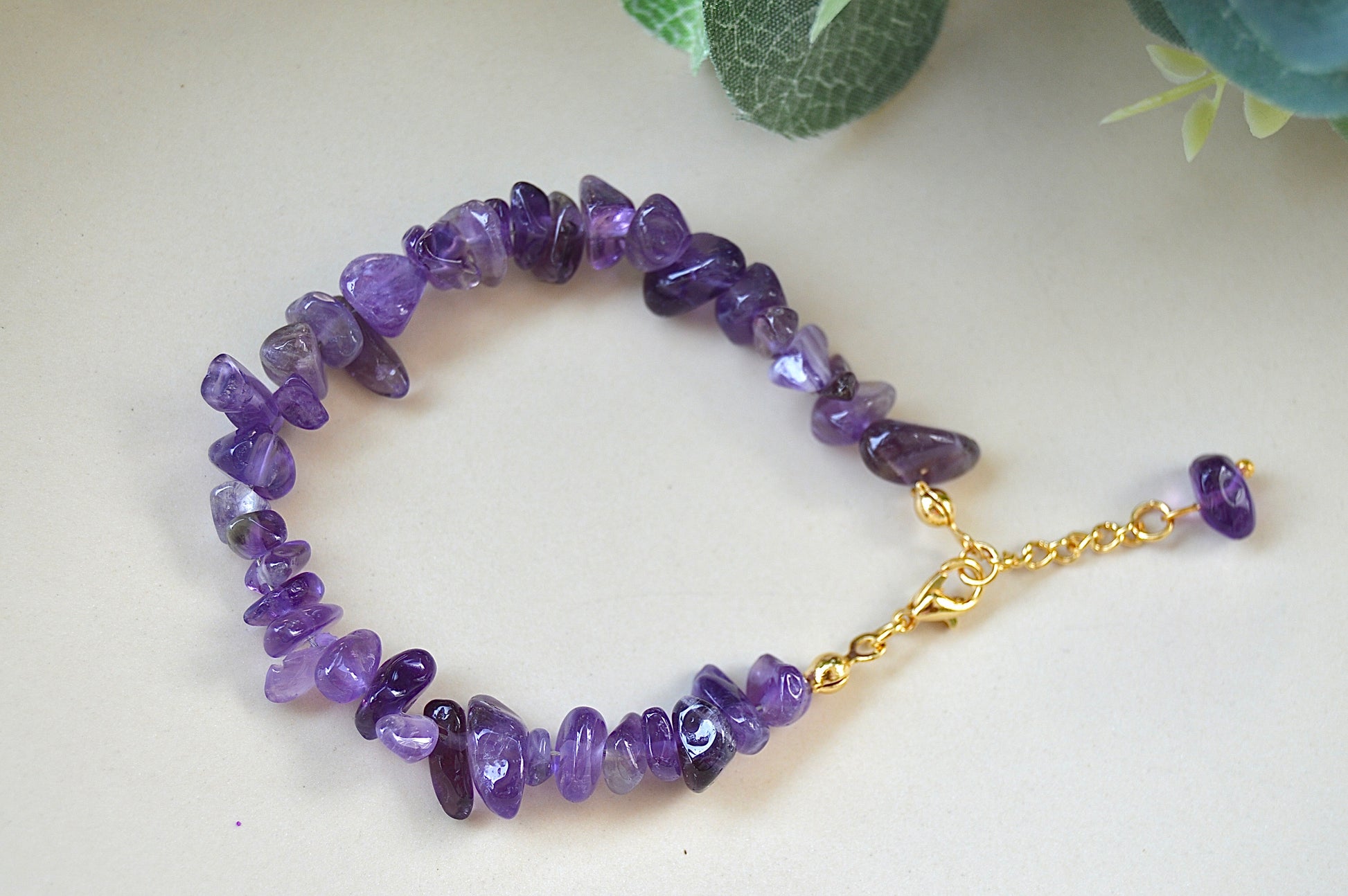 Et elegant og håndlaget armbånd laget av naturlige ametyst-steiner i chipsform, kombinert med delikate gullbelagte detaljer. De uregelmessige steinene gir et unikt og levende uttrykk – perfekt for deg som ønsker et smykke med karakter og dyp symbolikk.