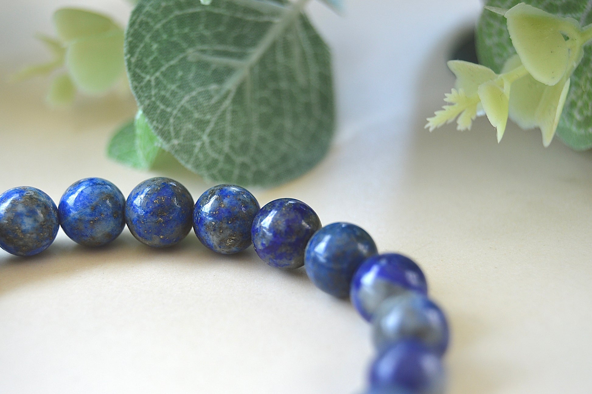 Et stilrent armbånd laget av ekte lapis lazuli, en dyp blå stein med naturlige gyldne innslag av pyritt. Lapis lazuli er kjent for sin kraftfulle og beskyttende energi, og har vært brukt i århundrer som symbol på visdom, ærlighet og selvinnsikt.