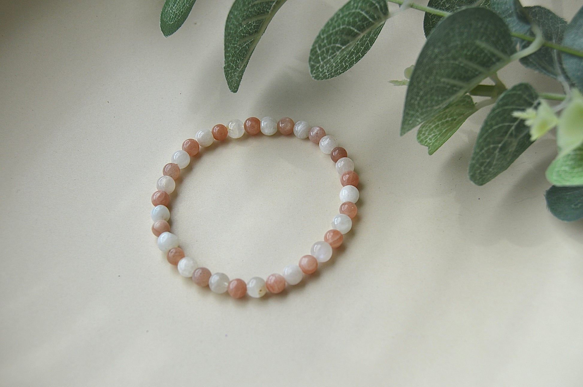 Et elegant armbånd laget med ekte månestein og solstein, med perler på ca. 6 mm. Armbåndet har elastisk tråd for god passform og passer håndledd på ca. 18 cm.