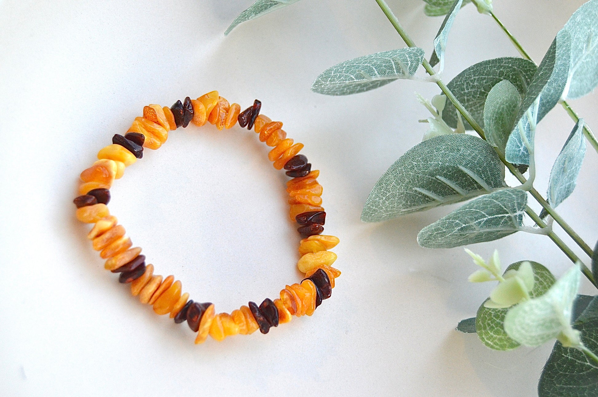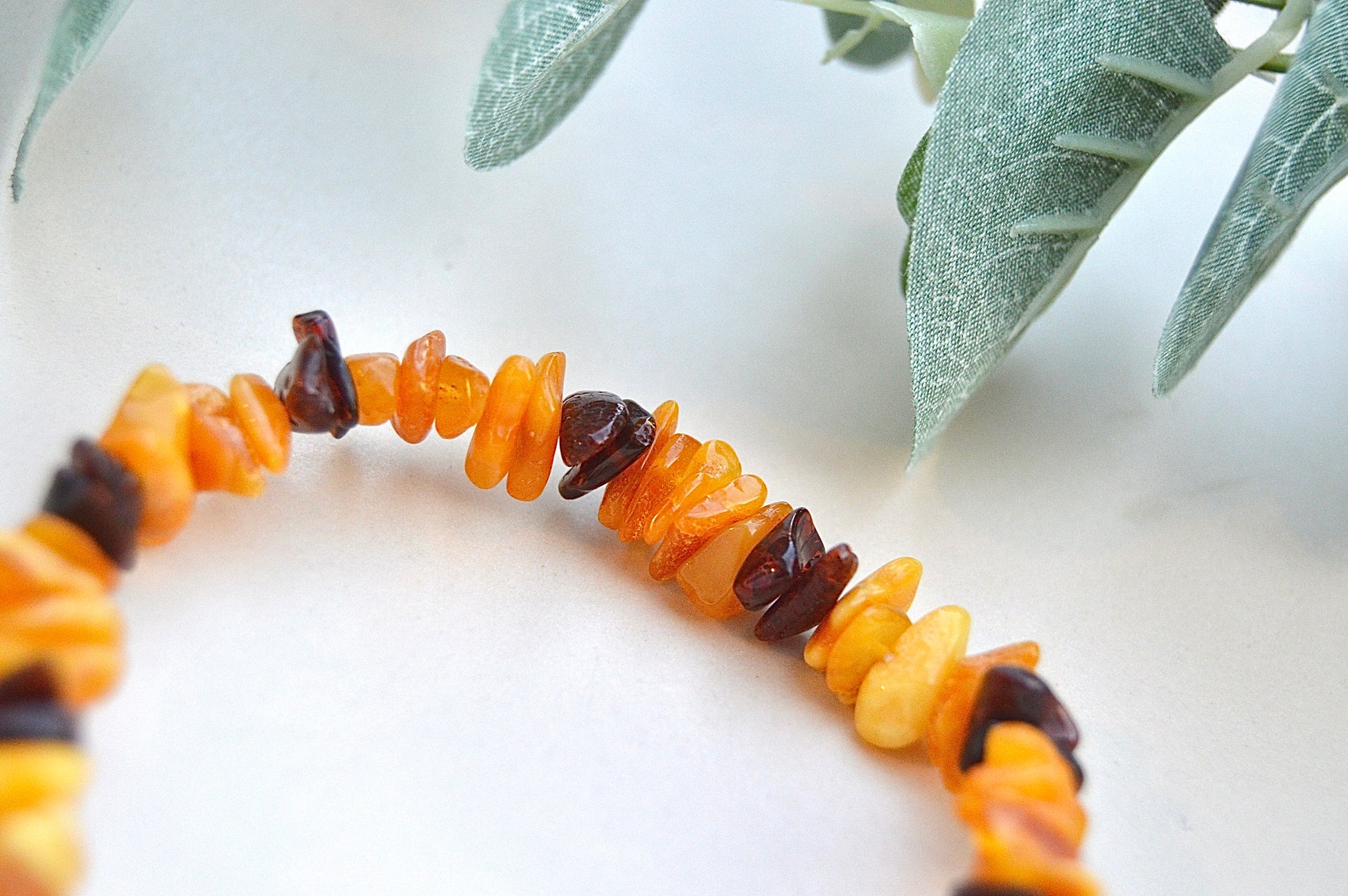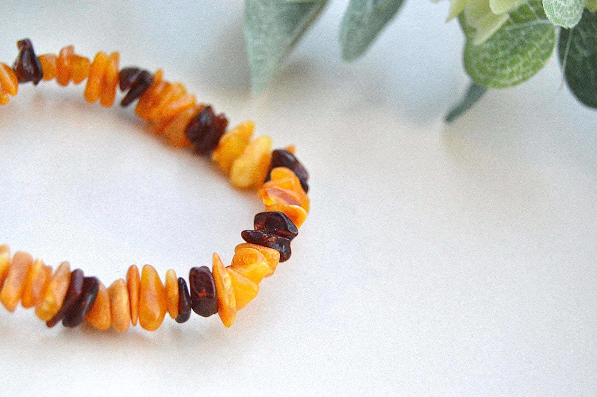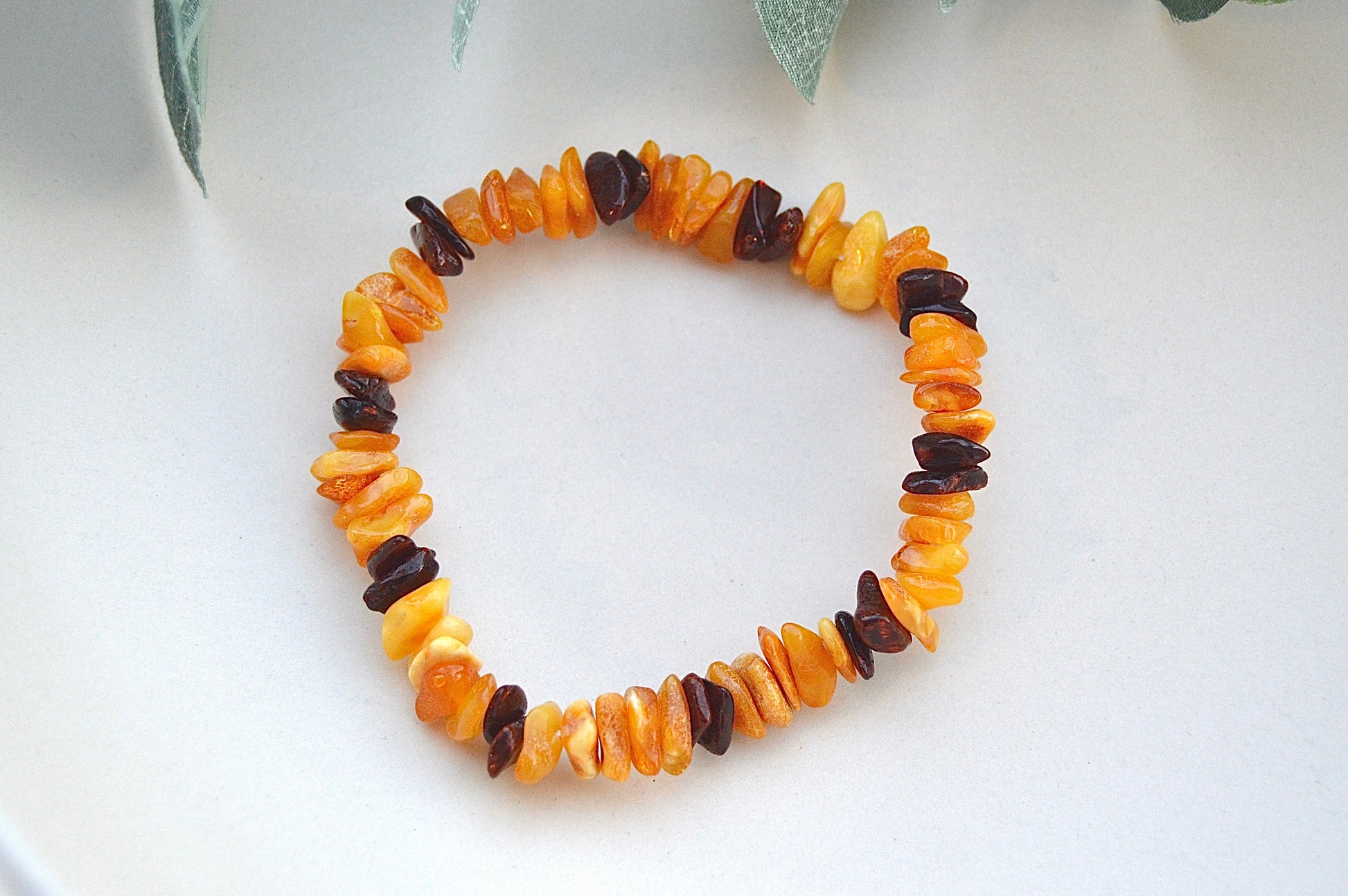 Dette vakre armbåndet er laget av naturlige ravperler i varme gultoner og dype konjakkfarger. Hver perle er unik og gir armbåndet et levende og organisk uttrykk. Et tidløst smykke med naturlig energi og et behagelig uttrykk – perfekt både til hverdags og som gave.