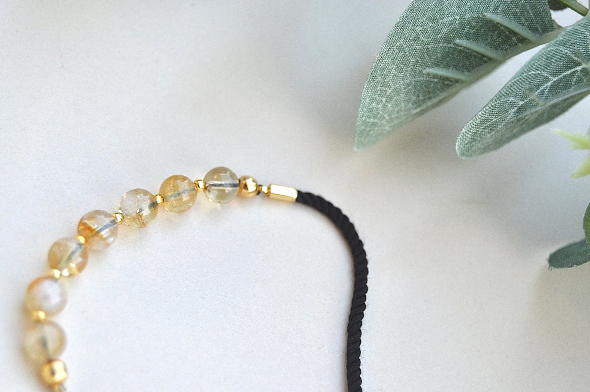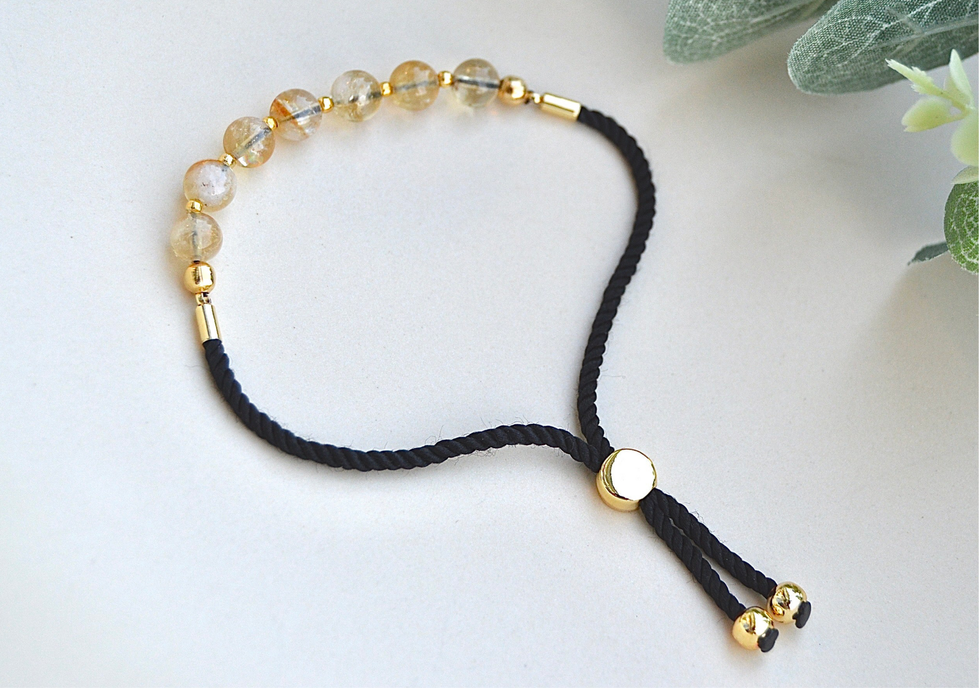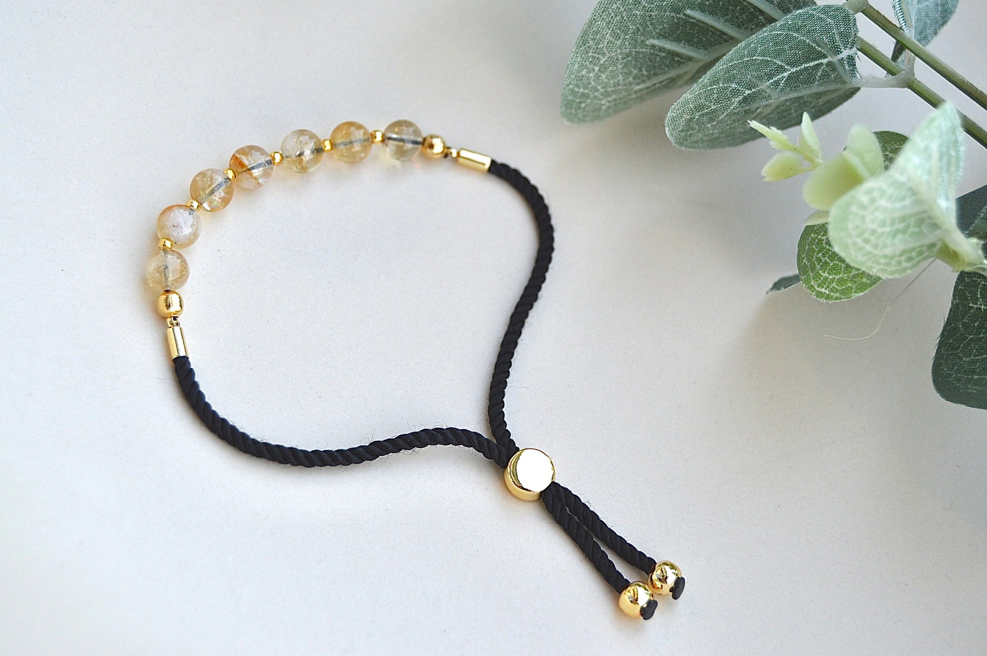 Et elegant og energigivende armbånd laget av naturlige sitrinperler i varme, gyldne nyanser. Perlene måler ca. 6 mm og kombineres med delikate gullbelagte detaljer og en justerbar svart snor som gir en behagelig passform for alle håndledd.